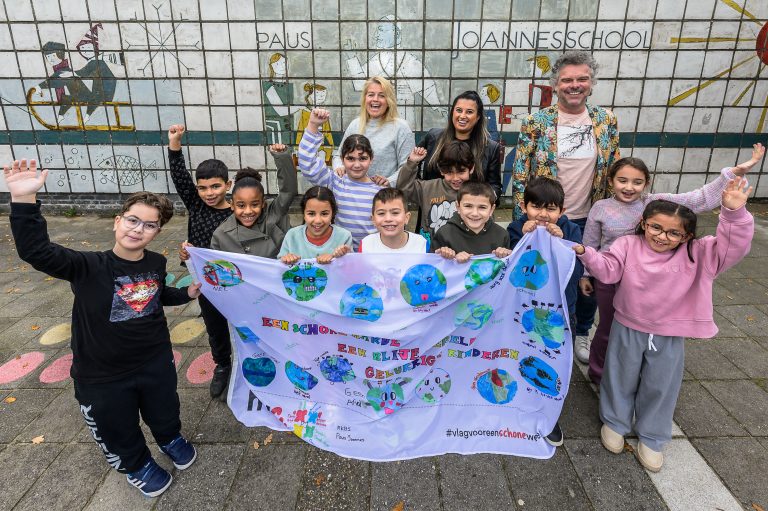 De kinderen uit de taalles-groep van basisschool Paus Joannes zijn al een tijdje bezig met lessen over Natuur en milieu. De creatieve vlaggenactie sloot daar perfect bij aan. Ela (8) “ik vind het goed als er minder afval is op de aarde. En ook in zee. Dieren eten soms het plastic en dan worden ze ziek of gaan ze zelfs dood.” Hoogste tijd voor een schone aarde, daar zijn ze het dan ook allemaal over eens. Hun vlag blijft tot maandag 17 november in de mast.