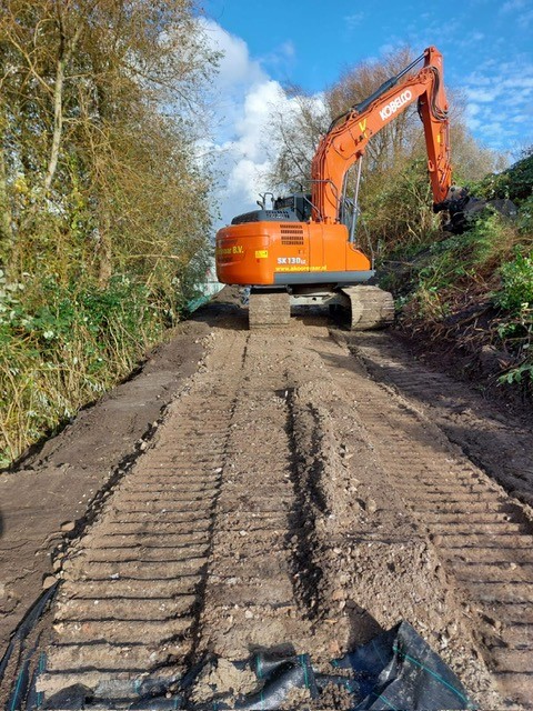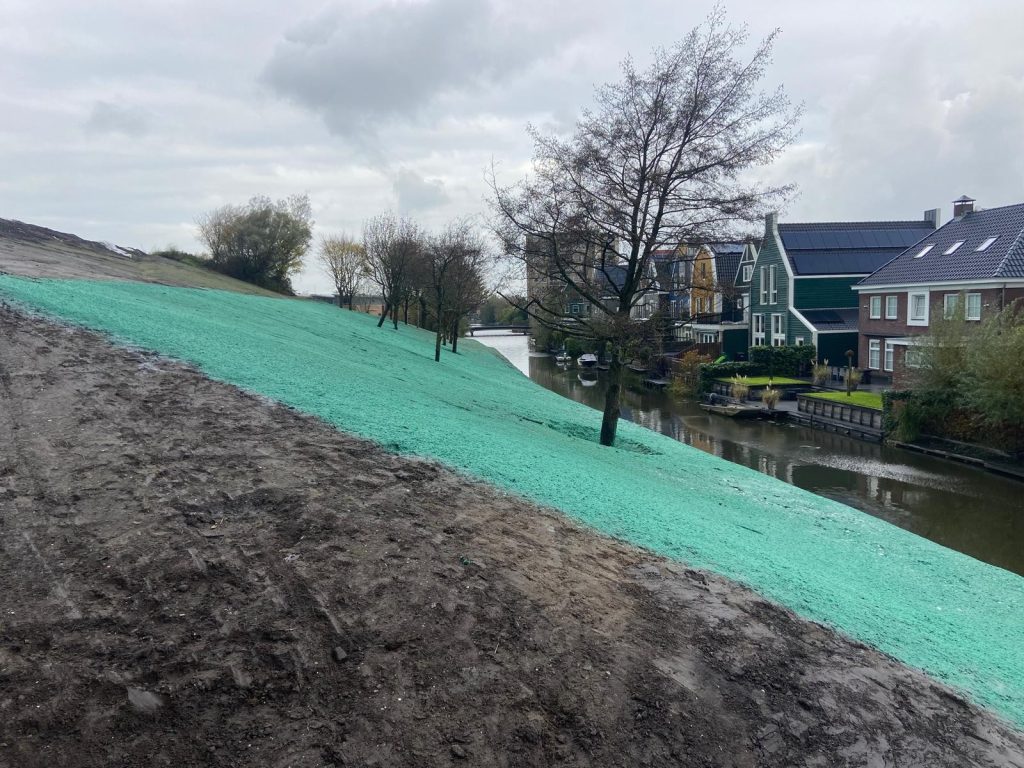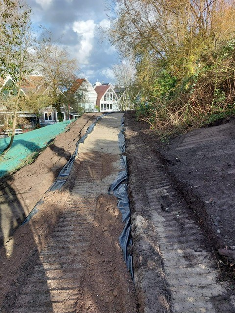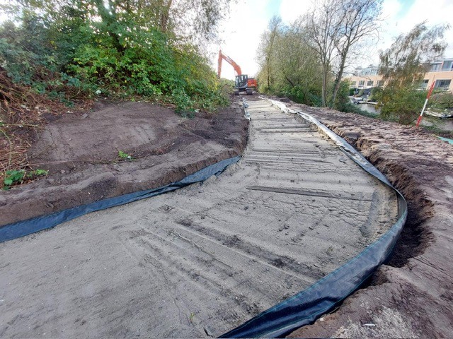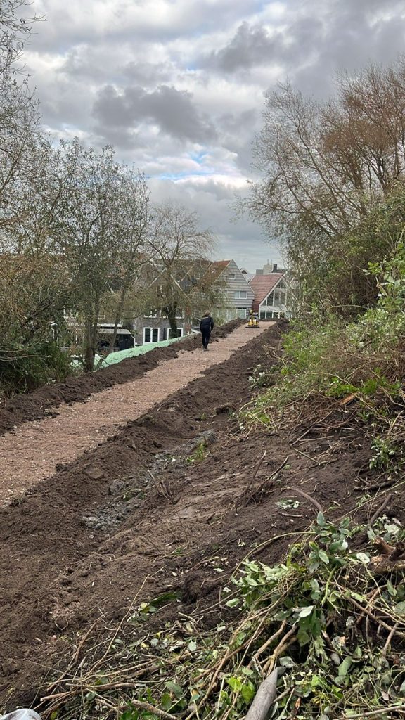 De aannemer is bijna klaar met de bestrijding van de Japanse Duizendknoop. We zijn begonnen met de aanleg van het nieuwe wandelpad rondom De Belt. Het geeft al een aardige indruk van hoe het er straks uit komt te zien. Ook is het gras ingezaaid. Dit is afgedekt zodat het beter kan kiemen. Deze natuurlijke afdeklaag verdwijnt vanzelf weer. Binnenkort planten we bollen, die komend voorjaar mooi bloeien. En we maken een begin met de aanleg van de trap aan de westkant en de geluidwerende palissaden langs de trap.