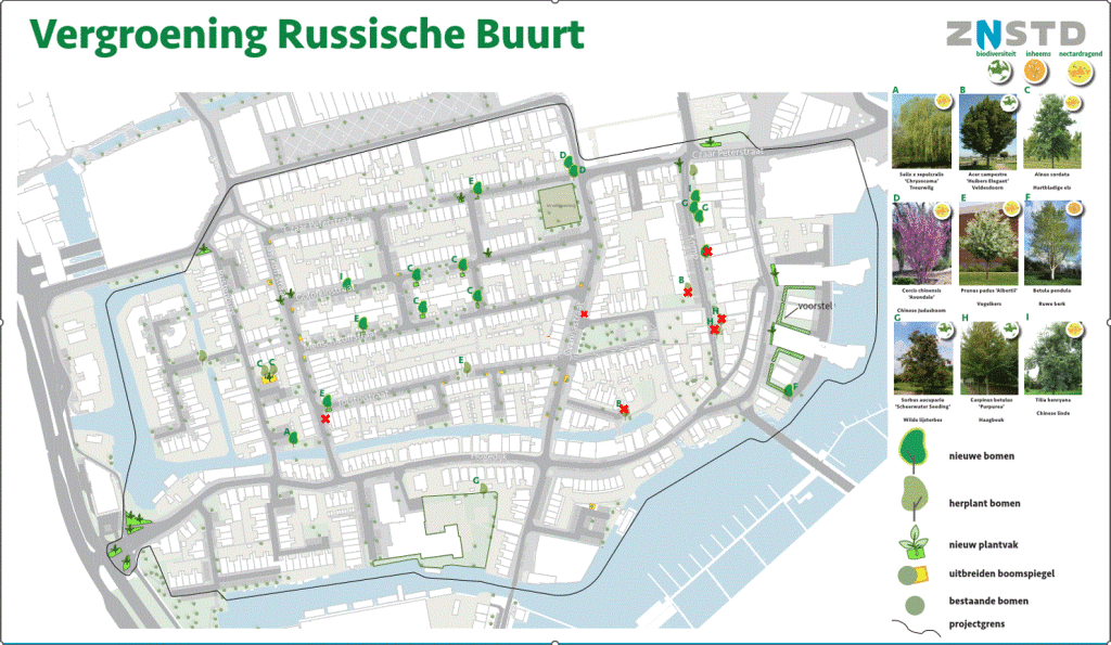 De Russische Buurt is een van de wijken in Zaanstad die meer groen nodig heeft. Op warme dagen wordt het hier extra heet door de vele stenen, en bij regen stroomt het water slecht weg. Uit de Buurtvisie Russische Buurt komt ook naar voren dat bewoners graag een groene, gezellige en leefbare wijk willen. Daarom kijken we waar in de wijk ruimte is voor meer groen. De plannen maken we samen met bewonersgroep Ruby (Russische Buurt) en andere bewoners.