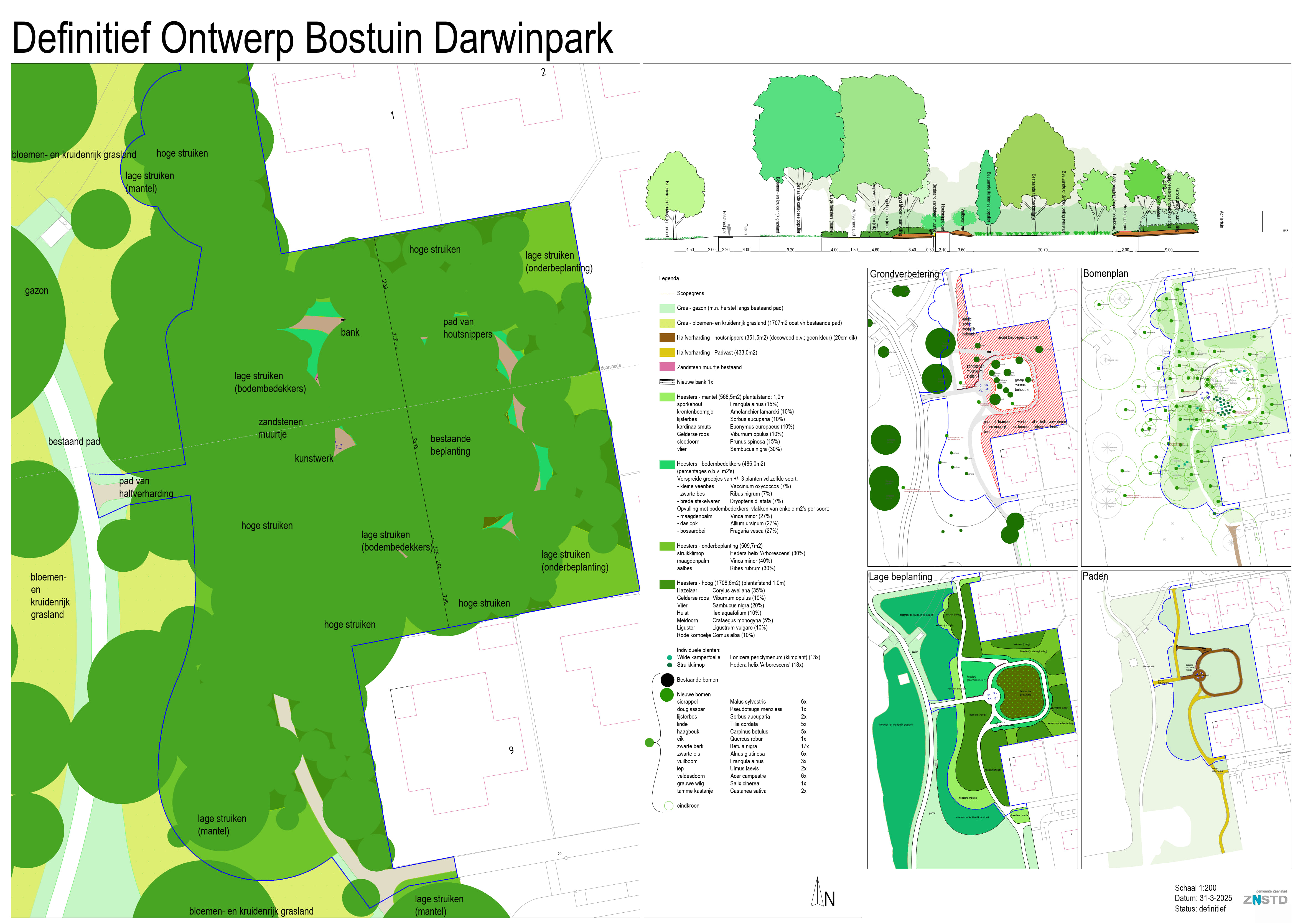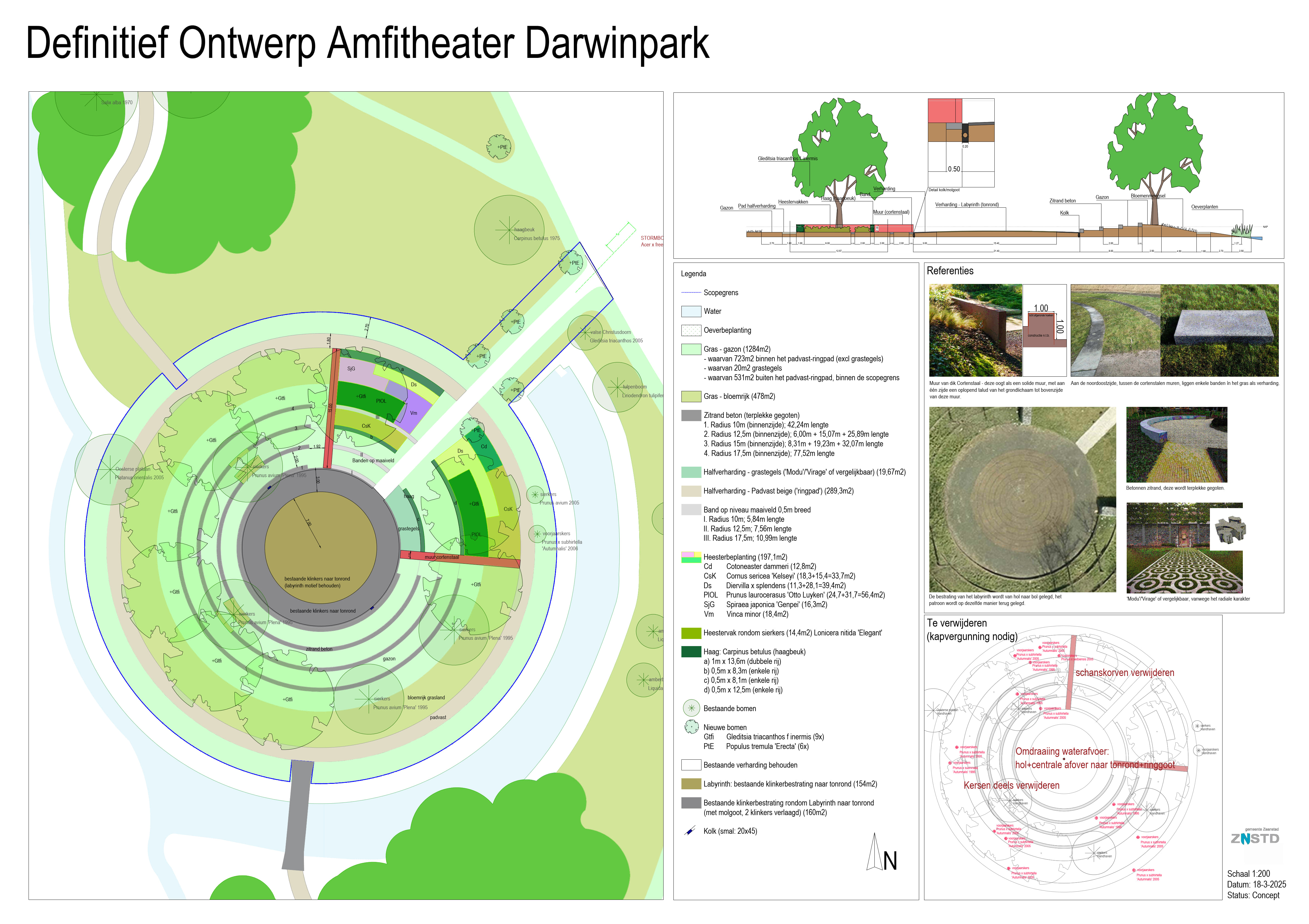 In het zuidelijke deel van het Darwinpark zijn vier “thematuinen” met landschapskunstwerken van kunstenaar Kees Bierman. In het noordelijke deel ligt het amfitheater. We gaan de onderdelen en het onderhoud verbeteren.