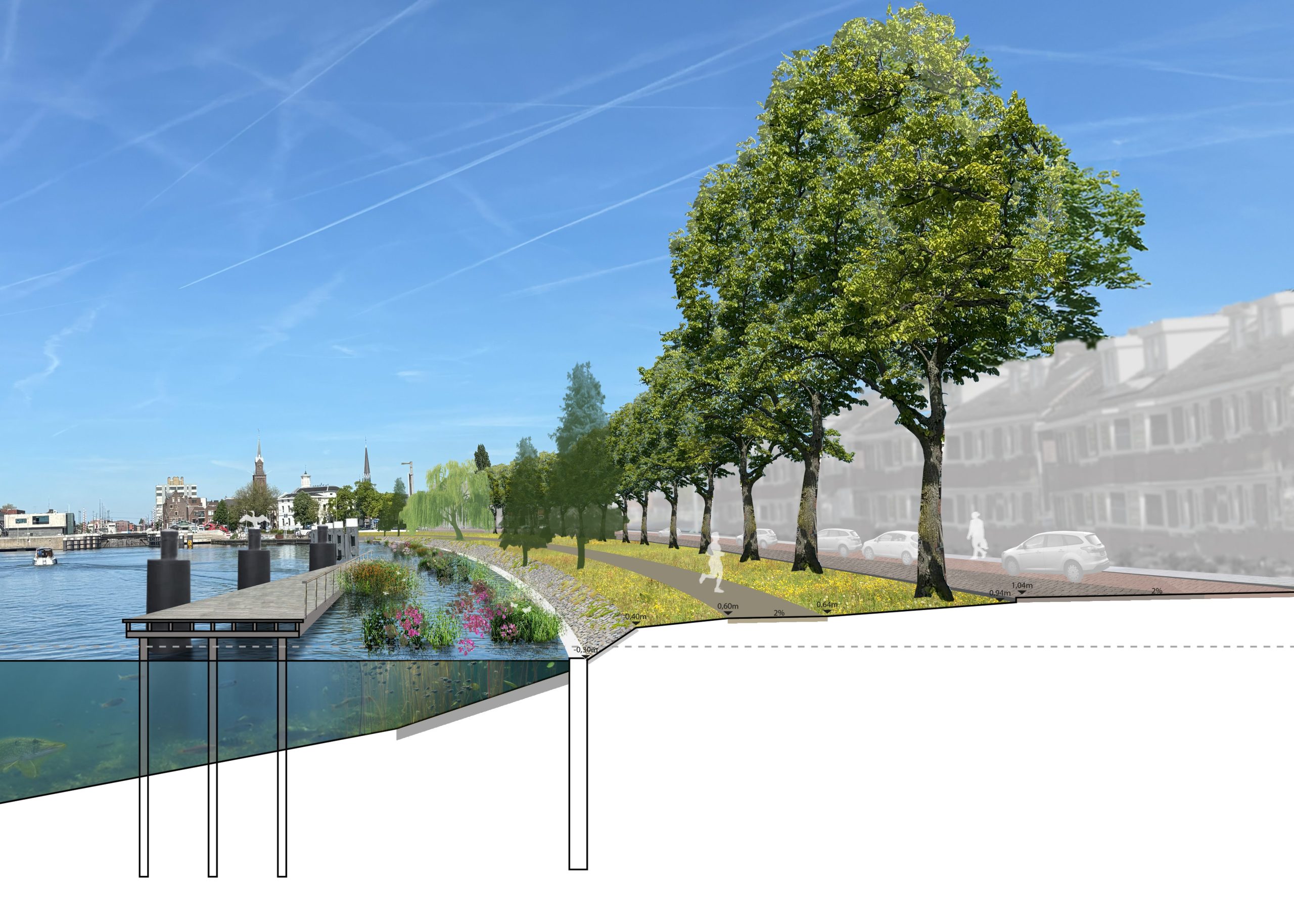 - Meer groen: We planten een bomenrij langs de kade en verbeteren de groeiruimte van de huidige bomen.