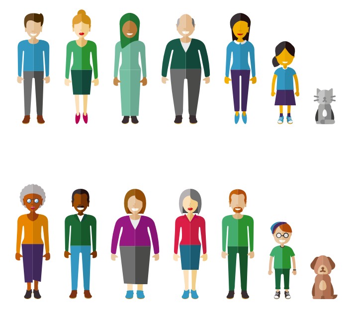 Als er twee of meerdere karakters gebruikt worden; zorg dan voor diversiteit m.b.t. gender, leeftijd, religie etc. De combinaties van kleding, haar- en huidskleur zijn vrij.