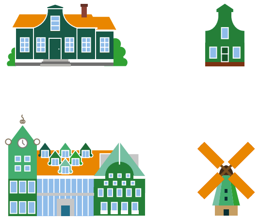 Het kan van belang (of leuk) zijn om de karakters op een (Zaanse) achtergrond te plaatsen. Gebruik in dat geval de hiervoor getekende gebouwen. Het aantal en type gebouwen is vrij. De kleur hiervan is bij voorkeur uit het primaire palet. Bij uitzondering en alleen bij niet-corporate uitgaven kan de achtergrond ook uit het secundaire palet gekozen worden.
