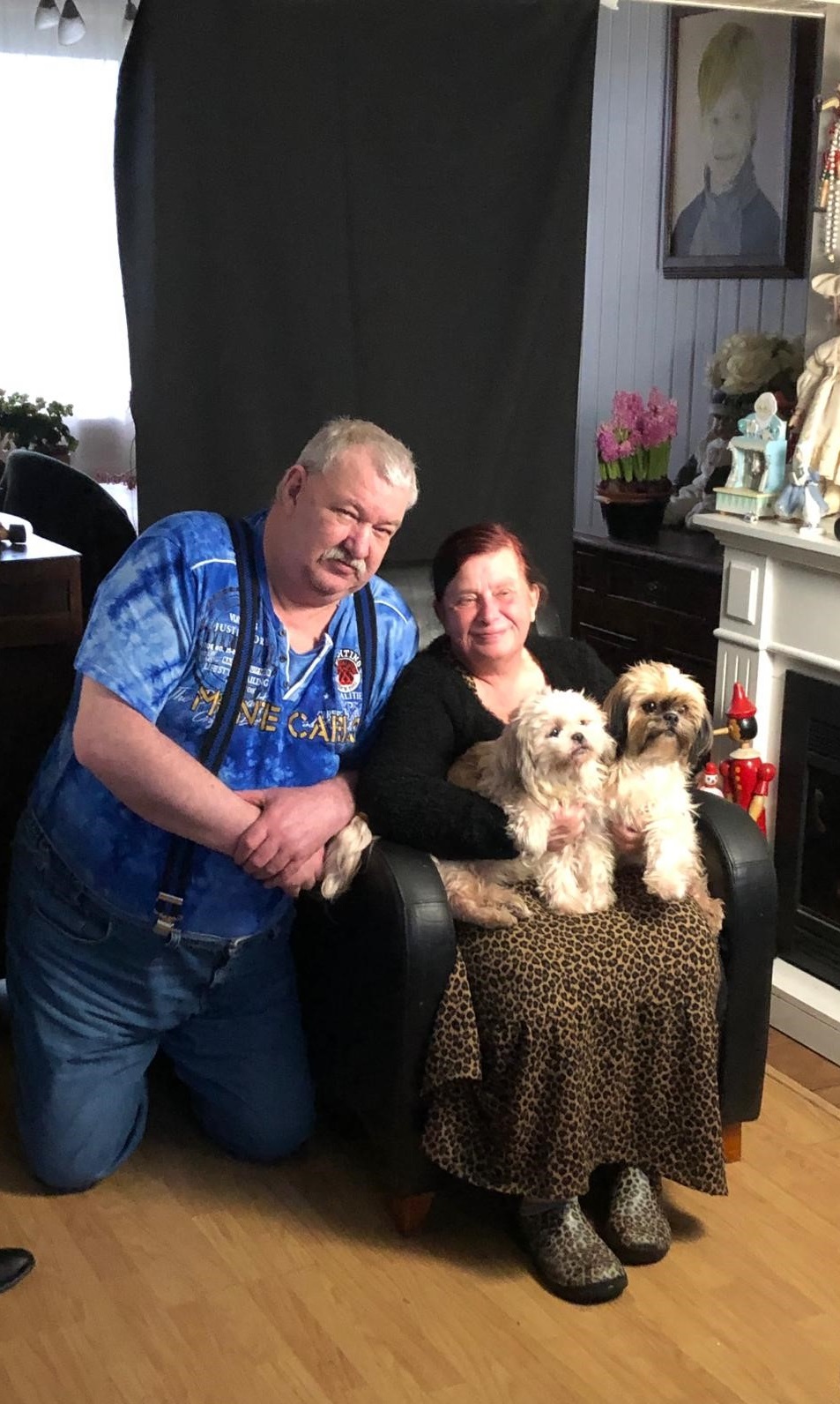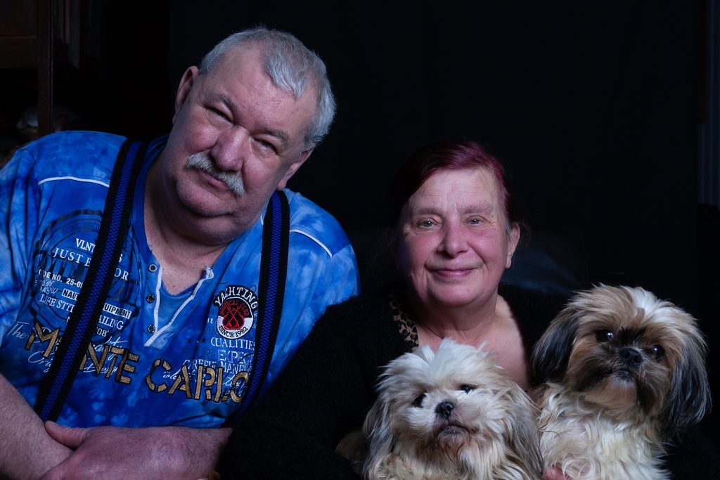 Lize heeft volgens de fotograaf een andere energie (David: ‘Ik kan de batterij van mijn camera opladen aan jouw energie’); hij ziet haar het liefst staand. Maar ja, Lize heeft twee kunstheupen, dus wil het liefste zitten. Wat er als kop boven dit artikel met komen te staan? Lize: ‘een lach en een traan’. Of: ‘lief & leed’. Misschien wel gewoon: ‘soberheid’. Want daar zijn ze wel van. Lize vertelt nog langs haar neus weg dat ze al hoopte op een mooie foto, voor als Rob doodgaat. Een eerste blik op haar eigen foto’s stemt haar tevreden, alhoewel ze ook iets venijnigs bij zichzelf ziet. Overigens is Rob een fervent muziekliefhebber en ook elpee verzamelaar. Zijn T-shirt verraadt zijn favoriete concert: Bruce Springsteen in 1999. Niet Rob zijn laatste concert van hem – dat was nog maar drie weken terug, vertelt hij glunderend – maar dat T-shirt zit in de was…